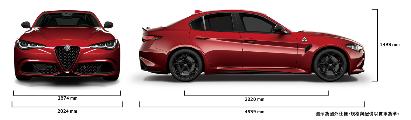 Alfa Romeo Giulia Quadrifoglio 擁有 4639 mm 車長、1433 mm 車高與 2024 mm 車寬,以力量感十足的車身線條,完美展現其大膽無畏的性能靈魂。行李廂最大容量達 480 公升,兼具跑格外型與實用空間,滿足日常與激情並存的駕馭需求。
